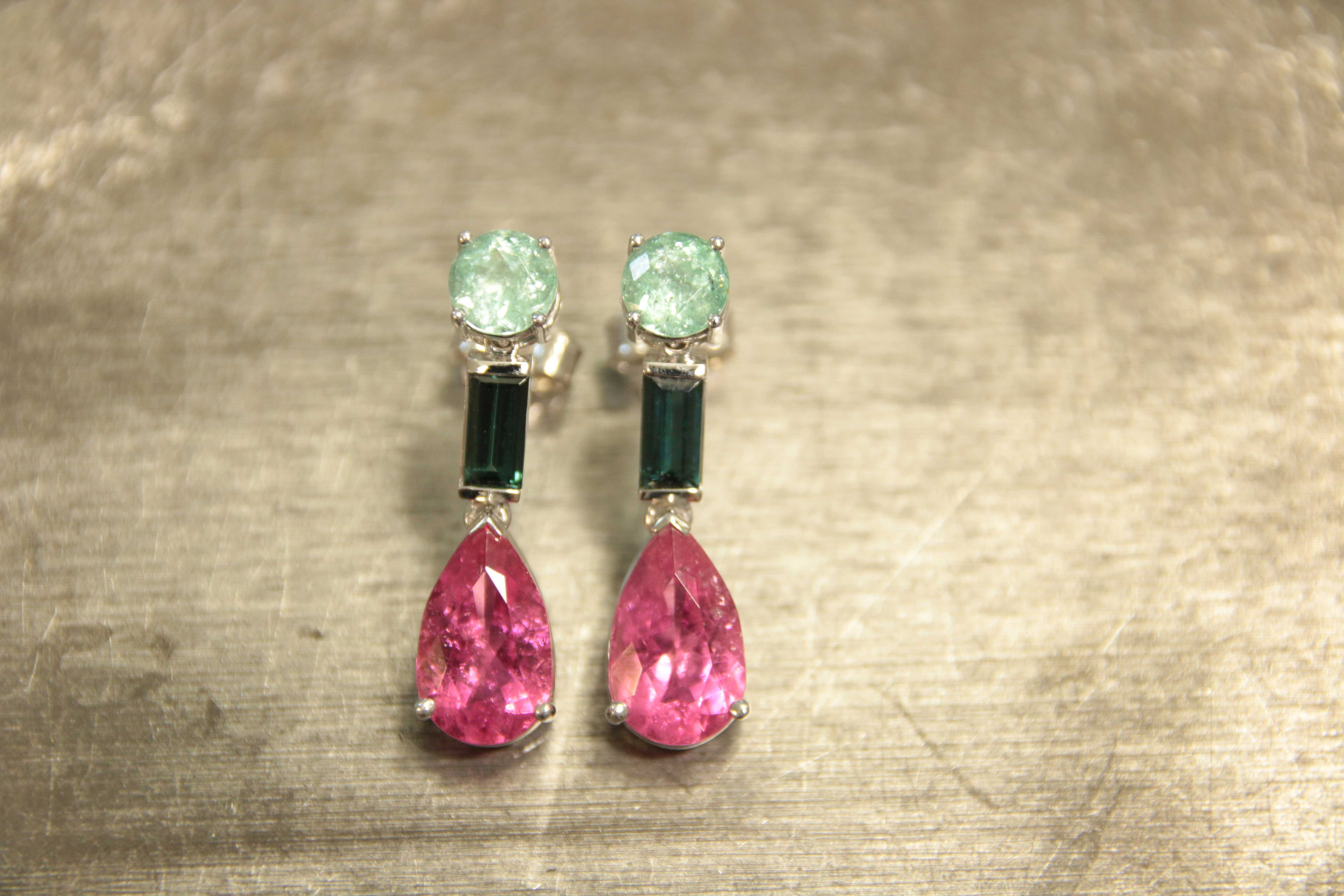 Ohrhänger Weissgold 750 mit 2 Paraiba Turmalinen (Afrika) 1.43 ct, 2 Turmalin Baguetten 0.83 ct und 2 Rubellit Tropfen (Afrika) 4.48 ct.