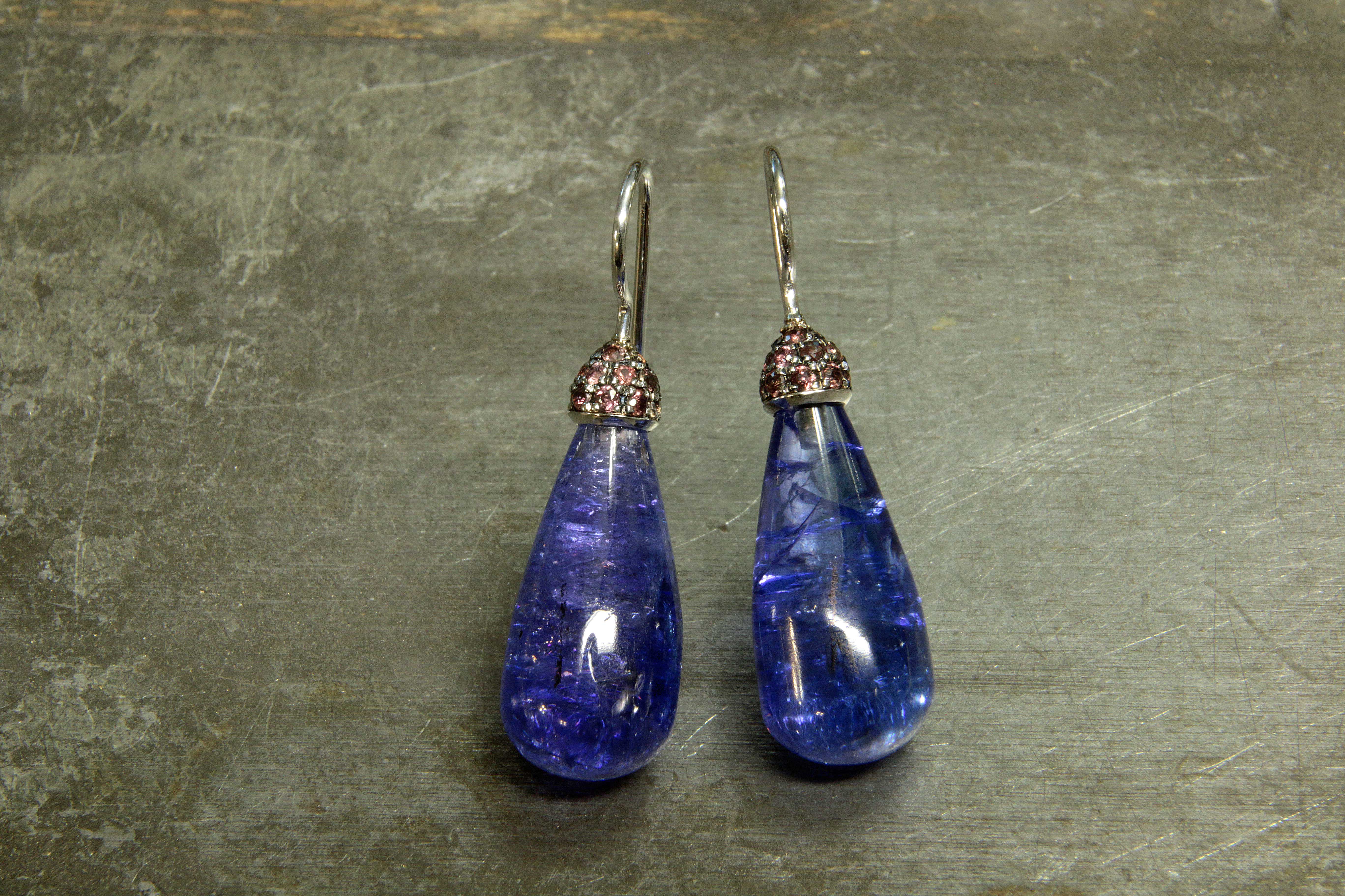 Tansanit Saphir Ohrhänger Weissgold 750 mit 2 Tansanit Pampeln 38.6 ct und 40 roten Saphiren 0.69 ct.